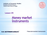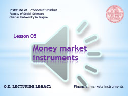 Money market vs. capital market instruments (day/year conventions, annual vs. periodic interest rates). Time deposit (effective and simple return, short-term yield curve, linear interpolation). Certificate of deposit (holding period yield). Treasury bill (discount, bond-equivalent yield). Sale and repurchase agreement (arrangement of repo, legal vs. economic treatment, haircut, funding purchase of bonds, leveraging bond portfolio, major tool of moneatry policy),