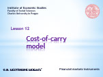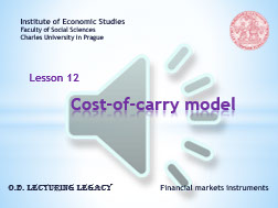 Carry. No-arbitrage conditions. Cost-of-carry formula (borrowing-cash strategy, borrowing-asset strategy). Carry with two futures contracts. Application for currency forwards (covered interest rate parity, uncovered interest rate parity, non-deliverable forward, carry trade). Application for zero-coupon bonds. Fair price of stock-index futures.