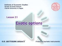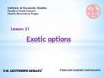Conventional versus exotic options. Classification. Asian option (average price, average strike). Binary options (cash-or-nothing, asset-or-nothing). Breakdown of a call and put into binary options. Package options. Barrier options (knock-in versus knock-out, up versus down). Breakdown of a call and put into barrier options. Compound options. Chooser options. Multi-asset options. Hybrid options.